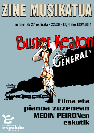 Baina, berandu da hauekin bueltaka hasteko eta guazen datozenetara. Nik sekula ikusi ez dudan ikuskizun bat dago ostiral honetan Espaloian: Zine musikatua . Zinea, mutua zanian bezala, "Buster Keaton"en "El General" pelikula, zuzenenan pianoz lagunduta ikusentzuteko aukera izango da. Pianoan Medin Peiron eseriko da eta pelikularenak diren partituretaz aparte, berak konposatutako beste batzuk joko ditu.