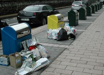 Eta kudeatzaileek hori sustatzeko ahaleginik egin ez arren, beraien aurreikuspen txikiak ere gainditu ditugu. Ikusi bestela zer gertatzen den gure auzoko edukiontzi eleganteetan. Papera eta ontzien edukiontziak gainezka, eta sailkatu gabeko zaborrarentzako edukiontzi lerro luzea txukun asko, dena jasotzeko prest.