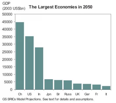 BRIC delako taldean ematen ari den garapen ekonomikoa eta etengabeko produktibitate igoerak alde batetik, eta indar demografikoak eta energia kontsumoaren joerak bestetik, potentzialki behinik behin, 2050 urtea baino lehen BRIC taldea G6-aren (AEB, Japon, Britaina Handia, Frantzia, Alemania eta Italia), hau da munduko 6 ekonomi aurreratuenen aurretik ipini daiteke. Buru hauste geopolitiko bat baino gehiago ekarriko du, seguru.