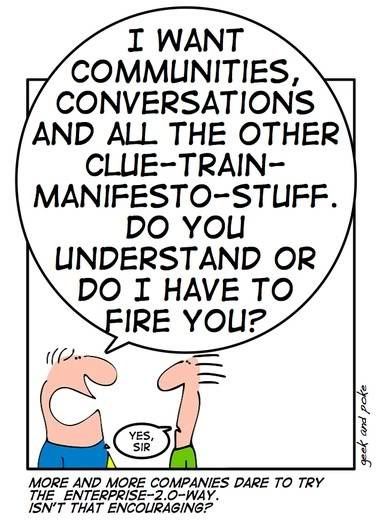 Cluetrain Manifestuaren 95 tesietarik 77garrenak zera dio: ¿Estás tan ocupado "haciendo negocios" que no puedes contestar a nuestro correo electrónico? Caramba, lo sentimos. Volveremos en otro momento. Quizá. Eta 96garrena beste hau izan zitekeen: Esaten ari garenaz honen seguru bageunde, ez al ginateke apalago izan behar?