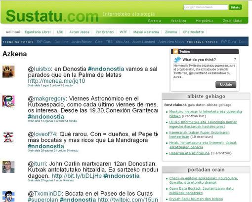Zirriborroan (ikusi handiago) nik ikuskatu nuen Euskotrend Sustatun integratua. Eta beste osagai batzuk: batez ere, Nirenews, David Gonzalez Ketarik martxan jarri zuen proiektu bat, ibilbidea oparoagoa merezi zuena (itxita dago orain). Hirien araberako azpi-twitter moduko batzuk ziren Nirenews desberdinak, eta arreta deitu zidan #hash bat sartuz gero bertara, auto-erreferentzia egiten zuela, esteka Twitterrera bueltan bidali barik. Duela egun batzuk erakutsi nion pantaila-irudi hau Ketariri, eta inspiraziotzat balio izan bazuen, pozten zela erantzun zidan. Eskerrik asko. Gipuzkoako Interneteko ekintzaile ipurloka eta jatorrenetakoa da Ketari. Banku batean, sistemetako katakunbetan, omen dago lanean, baina beti beste gauza batzuk makinatzen, orain ere izango du zerbait esku artean.