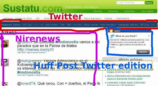 Irudian erantsi nituen beste osagaiak dira Trend jarioa, Twitterren garai hartan agertzen zen bazala; eta The Huffington Post albistegi digitalak sortutako Twitter edition direlakoetan ikusitako kutxa bat, bertatik zuzenean tweet egiteko modu sinple bat.