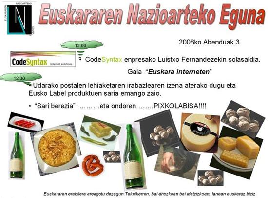 Eibarko Tekniker zentro teknologikoan ohitura dute ekitalditxo bat egiteko abenduaren 3an, Euskararen Nazioarteko Egunean. Iaz Andoni Egaña bertsolarien txapelduna izan zen hizlari. Aurten neu gonbidatu naute. Euskara eta Internet, hori izango da nire hitzaldiaren gaia.