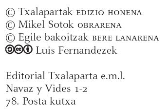 Liburuaren kredituetan, Creative Commons-eko ikonoekin utzi dute adierazita lizentziaren kontua. Liburuaren azala Esteban Montoriorena da, eta hemen duzue: