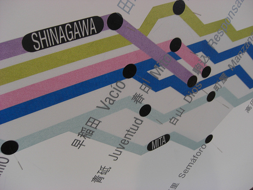 Giza-gorputz bat ere bazegoen, metro mapa baten gisa paretean. Japonierazko eta gaztelaniazko berbak agertzen ziren estazioen tokietan, baina Tokyoko bertako benetako geltoki izenak ere bai, lagun eusko-japoniarren etxetik gertuen zegoen Shinagawa lotune handia bezala, Tokyo hegoaldean.