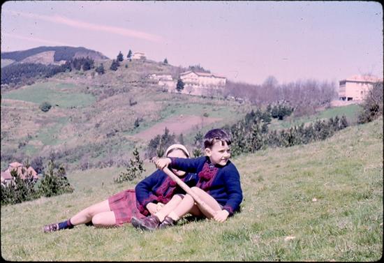 Hamen dagoz Emma eta Oswaldo, nere anai-arrebak. Francon denporako kaikutxuekin, Arrateko kurutze aldian olgetan. Eta atzian hiru eraikin ikusten dira: eskuman, hurren dagona, kolonixak izango diraz; atzerago, erdikaldian, gaur egungo Krabelin hotela; eta gorengua, etxe txiki ha... Olabeneko txaleta. Sorpresa haundixa izan zan argazki hau neretako. Nik beti zelai huts lez ezagutu dot "la campa de Olabe" hori, baiña ez neban etxian irudirik ezagutzen. Hamen detalle gehixago.