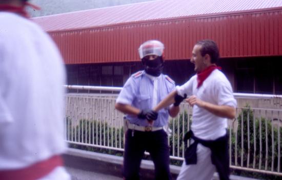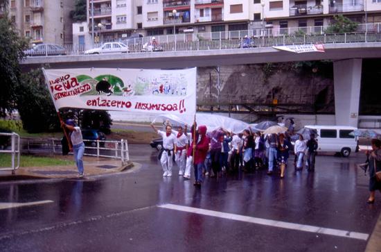 Oin dala hiru urte aittatu neban Eibarko Talde Antimilitaristiak egindako "entzierrua". Beste hainbeste ekintza gogoangarrin artian, ikusgarrixenetakua izan zan hau. Hiru intsumisok -tartian Patxi Argarate, gure Kalamuako Parlamentuan dibujantia- poliziakuengana jo zeben bere burua atxilo eskintzeko, modu orijinalian. Hamen dagoz orduko argazki batzu.