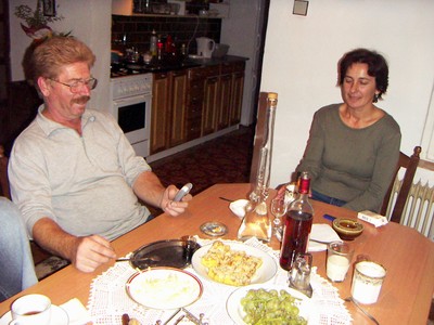 Noski: slovakiar peto-petoen artian gengozenez, asko kostatu jakuan alkoholarengandik iges egittia. Afarixa laguntzeko medovina gozua jeguan, eta postre sasoian Fero etxeko jauna agertu zuan berak egindako "slibovitza" (okaran pattar inzendiarixua) botilla batekin. Botilliak fusil formia jeukan, gainera. Deskortesixiaren mugan ibili ginala ba jakixagu, hamengo ospitalidade zentzu haundixa jaten eta ostatu emoten isladatzen dalako, baina nik behintzat ez najuan nahi nere osasuna eta ongizatia sakrifikatzia kortesixiaren alde. Beraz, kristorenak eta bi egin eta gero sahiestu genduzen kopa gehixenak; hala eta guzti be, etxeko pegorako "kapurkova" edo espuelatik ezin izan ginan libratu. Izan be, gonbidatuak ("hostia", slovakieraz) alde egittera doiazenian, botak jantzi eta pegoratik atarira urtetzeko momentuan ¡taka! hantxe etaratzen jakek kapurkova alu hori, eta haxe bai derrigorrez edan bihar duala. Ahosabaixan tiro bat besain goxua. ¡Errrrrredios! Zelako destenple, hotzikara eta gomittolarrixa kotxian atzera sartzian.