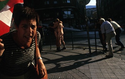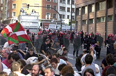 Bero-bero nenguan, eta ez neban ondiok miñik sentitzen. Alde batetik ur-tankia neukan eta bestetik txakurrak manifestarixei erasoka; han urriñian, jendia lurrian eseritta egurra hartzen. Ordurako jendia orruka hasitta zeguan (“Gora Euskal Herria“, “Euskal Herria aurrera“...) eta botillak hegan, pelotak topeka gureganaiñok zetozen.