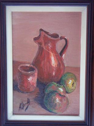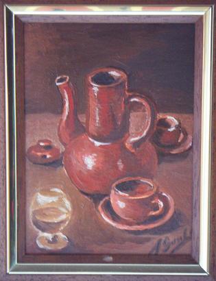 Hamen bodegoi pare bat, hónek be arrebian etxia dekoratzeko egindakuak. Buztiñezko ontzi baterixa hau amanian dago, ezelako dekoraziño barik baiña (biharbada horregaittik) asko gustatzen jata. Ez dakitt noiz erosittakua dan, ni umia nintzala uste dot, baiña erabilli erabilli gitxittan egin izan dogu; kafe katilluak zeozer igual. Erabilpen nagusixa, beraz, piktorikua izan da.