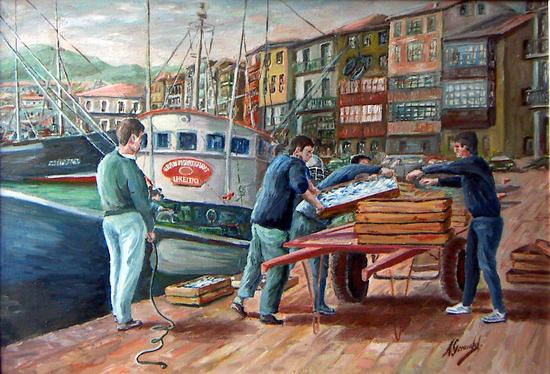 Gran Montserrat baporrekuak deskargan. Perogrulladia esateko, mobimendu haundiko kuadrua. Urdin illunezko tono asko bertan, sasoi baten Lekeittioko kolore ezaugarrixa.