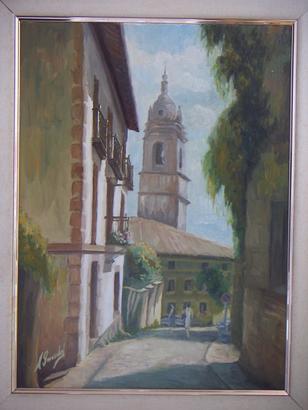 Kuadro hau 1985 ingurukua izango da. Lekeittioko elizia agertzen da bertan, Gerrikabeitia kaletik. Neri neuri etxata asko gustatzen, kolore hillegixak dakaz nere gusturako. Baiña exitua... demasa! Jentiari asko gustatzen jako. Aittari bebai, etara kontuak: oker ez banago, erakusketetako kartel legez be erabilli izan genduan...