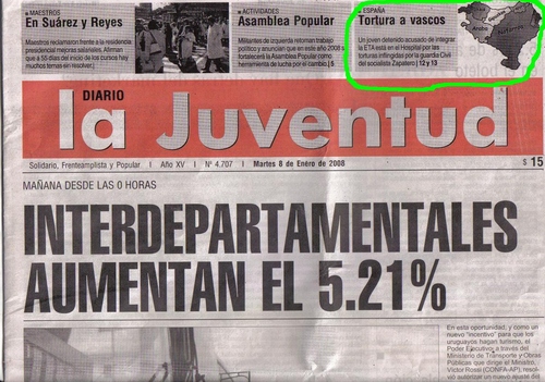 Uruguayeko izperringi baten agertzia, tira, ulertu leike; baiña El Diario Español moroko egunkari batian... Etxakixat zer pentsau. Bildurra dakat nik, oin batzu ez ete daben hasiko torturian zillegittasuna defenditzeko kanpaiñia: "Jakiña torturia biharrezkua dala; bestela zelan konfesauko dittuez ba euren kulpak?".