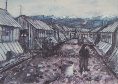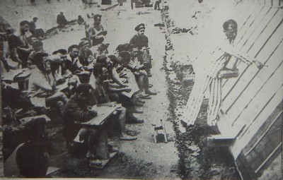 Hona errefujiatuetako batek egindako marrazki bat; Gurs-en bizi izandakuak bereziki goguan jaukek eurixa egittian (takian potian) bidietan egitten zuan basatzia