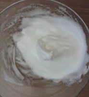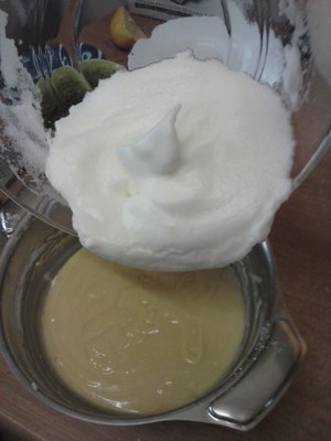 Aparte gorringoak azukrearekin irabiatu eta gainontzeko osagaiekin nahastu. Nik irina iragazi egiten dut, fintzearren. Limoi tanta batzuk beharrean limoi azal birrindua bota dezakezu, edo limoia beharrean laranja erabili, zure gustuaren arabera. Orain merengea gehitu nahasketa honi, eta poliki-poliki koilara batekin nahastu.